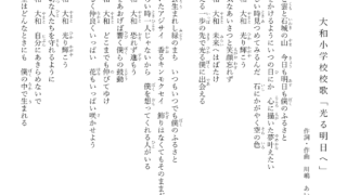 各種お知らせ 校歌「光る明日へ」 大和地域の4つの小学校の児童から寄せられた言葉やフレーズ、そして大和地域の皆さんから寄せられた言葉やフレーズをもとに、シンガー・ソングライターの川嶋あいさんに作詞・作曲していただいた校歌です。テーマは『自分自身を信じること』。新たに誕生する... 2025.02.10 各種お知らせ大和っ子NEWS
