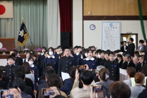 旧4小の児童が一堂に会して初めて歌う校歌「光る明日へ」。子どもたちの明るく元気な歌声で、式の最後を飾りました。