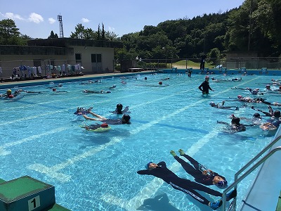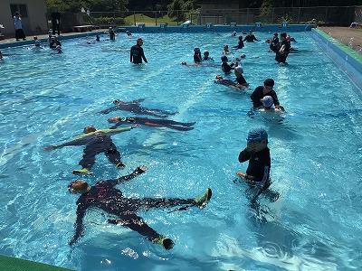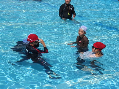 人は浮くようにできていること、慌てて大声を出したり、もがいたりするから溺れてしまうこと、浮いて待つことが一番大切であることを教えていただいた後、子どもたちも背浮きにチャレンジしてみました。