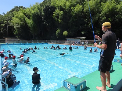 最後に、救助を待つことを想定して5分間浮いて待つ体験を行いました。プールは静まり返り、力を抜いて浮かび続ける子どもたち。いざというときのために、真剣に取り組む子どもたちの姿をほめていただきました。