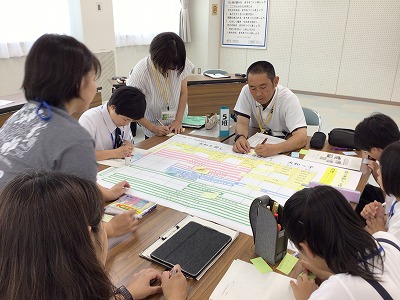 会の後半、やまとミーティング(熟議)では、小学生、中学生、高校生、教職員、地域の方々、およそ80名が、8つのグループに分かれ、新しい「小中一貫地域連携カリキュラム」について話し合いました。