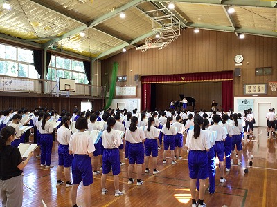 小中合同合唱の指揮や全体のリーダーは、中学生が行います。150名を超える小中学生を取りまとめながら堂々と指揮をする中学生の姿は、小学生5・6年生にとっては、あこがれの姿ではないかと思います。このような姿を見ながら、なりたい中学生像を描き、成長していくのでしょう。