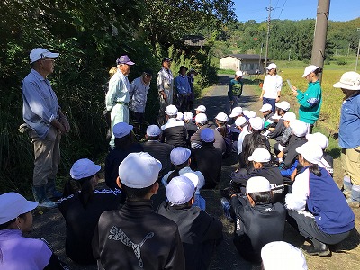 「初めての体験だったけれど、うまく刈り取ることができてよかった。」「いろいろな虫や生き物が出てきてびっくりしたけど、最後までやり遂げられた。」等、素直な感想を伝え合い、田んぼの会の方も一緒になって、笑顔いっぱいの振り返りタイムとなりました。