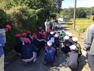 6月に田植えをさせていただいたのは、5年生でしたが、稲刈りは5・6年生で行いました。実は、昨年度、旧岩田小学校の5年生(現大和小6年生)は田植えはしたものの、悪天候により、稲刈りが出来ないままになっていたのです。そこで、この機会に現6年生も体験させていただくことになりました。