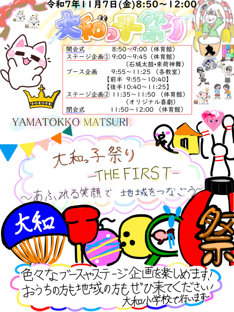その成果と経験を生かすべく、新設された大和小学校でも、子どもたちによる祭り「大和っ子祭り」を下記のとおり開催することとしました。子どもたちはもちろんのこと、保護者・地域の皆様も笑顔あふれる、心のつながる祭りになればと思っております。保護者・地域の皆様、どうぞお越しください。