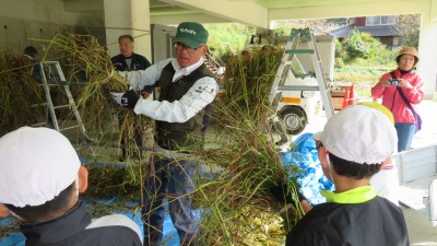 市の農業指導員の先生にそばの刈り方を教えていただき、早速、そば刈りです。