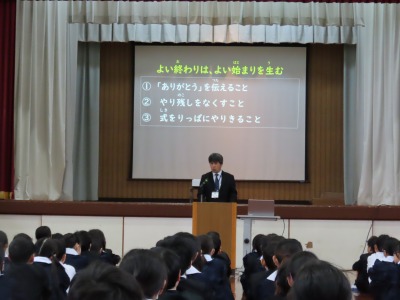 校長からは「よい終わりは、よい始まりを生む」とのメッセージが贈られました。よい終わり方を迎えるために、①「ありがとう」を伝えること、②やり残しをなくすこと、③式を立派にやりきることを、みんなでがんばっていうこうと呼びかけられました。みんなで「最高の終わり」をつくり、次の学年での「最高の始まり」を迎えましょう。