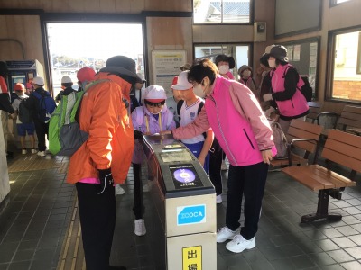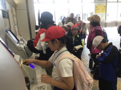 切符を自動改札に通します。うまくできるかな。今回の遠足には大和更生保護女性会の皆さんにサポートいただいています。