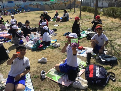 おうちの方のつくってくれたお弁当。春の訪れを感じさせる天気。おいしさ倍増です。