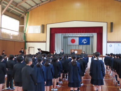 転退職する教職員からの挨拶を、子どもたちは真剣な眼差しで聞いていました。