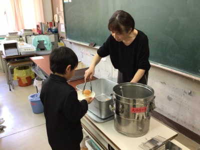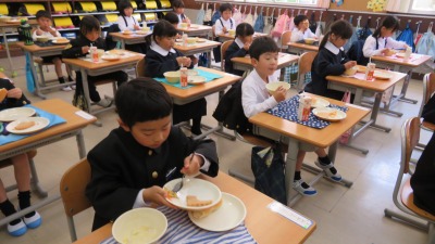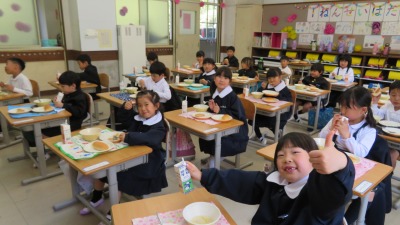 「おかわりしたよ!」「ぜんぶたべたよ!」と1年生の両学級から元気な声が聞こえてきました。みんなと食べる給食は、一段と食が進むのかもしれません。これからもおいしく食べてくださいね。
