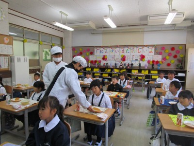 4月16日は、1年生にとってはじめての給食でした。給食の配膳は、6年生のお兄さんお姉さんが手伝ってくれました。